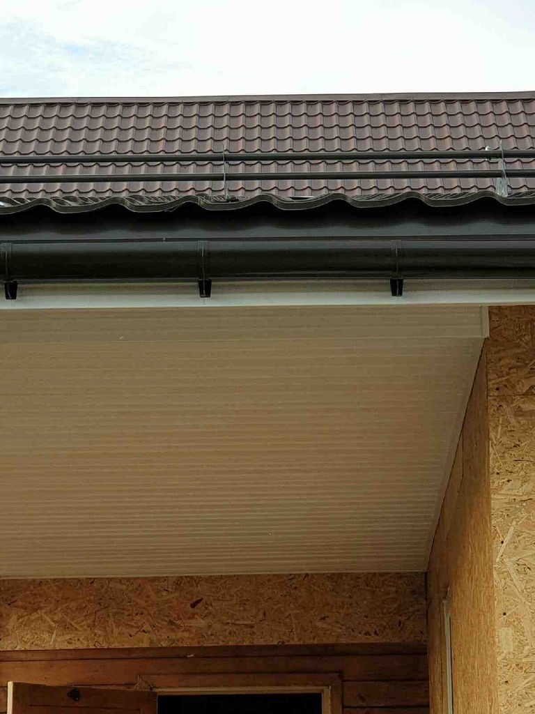 • Установка карнизных планок из металла в цвет кровли. Защиту краев обрешеточного бруса от воздействия внешней среды обеспечивают карнизные панели. Монтируются панели на подкладку внахлест с перекрытием на 20 мм и фиксируются гвоздями. Шаг крепления – 100 мм;